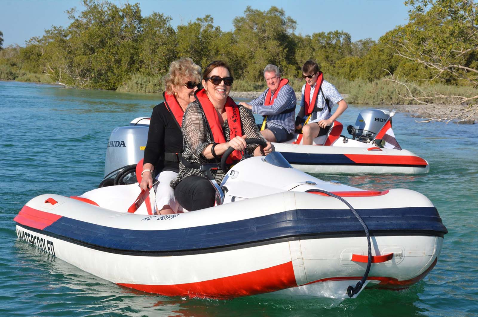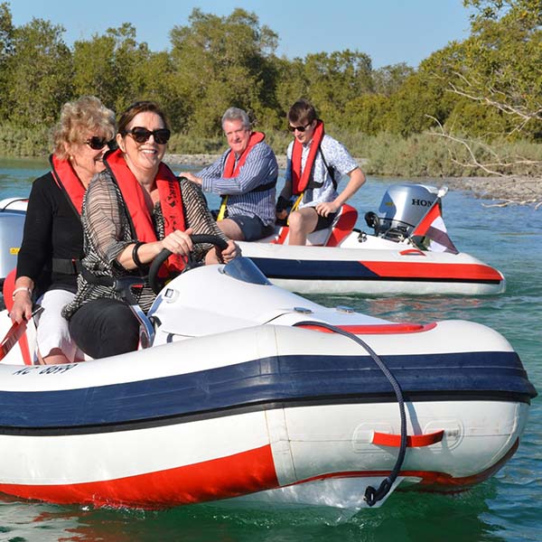 Pilot your own Rhino Rider speedboat through the lagoon past flamingos and the Sheikh’s palace into the mangroves following your guide. Keep an eye out for crabs, herons, turtles and even dolphins as you maneuver through the canals. Briefly stop on a deserted island where you can do a little exploration or take a refreshing morning swim in the sea.